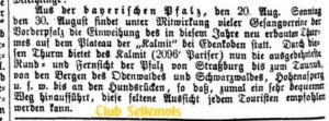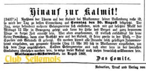 [3437’/.] Nachdem der Thurm auf der Kalmit bei Maikammer seiner Vollendung nahe ist, so wird der Tag zu dessen Einweihung auf Sonntag den 30. August festgesetzt. Der Zug, wozu besonders mehrere Gesangvereine sich einfinden, wird mit gut besetzter Musik des Mittags 12 Uhr in Bewegung gesetzt und dann die Höhe des Berges auf ganz bequemem Wege in kurzer Zeit erreicht sein. Wer oben angekommen, ist vielfach entschädigt für seine kleine Bemühung, denn eine Aussicht wie auf der Kalmit, ist keine zweite in der Pfalz. – Für Speisen unb Getränke ist gesorgt. Es werden hiemit alle Freunde solch geselligen Zusammenseins eingeladen, um genannte Stunde (Zug 11 Uhr 16) sich in Maikammer einzufinden, um sich dem Zuge anzuschließen. Sollten Gesangvereine aus nhb ober fern in der speciellen Einlabung übersehen worden sein, so möge dieser Aufruf auch diesen freundlich willfommen sein.
