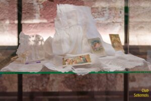 Nottaufkleid der Hebamme Katharina Schädler. (Foto: Ausstellung des Club Sellemols „Kirchliche Feste und Familienfeiern“, 2025 in den Vitrinen der Touristinfo Maikammer.