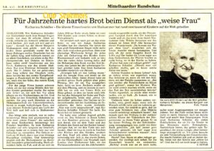 „Wer Katharina Schädler aus Maikammer nach dem Rezept fragen würde, wie man 96 erfüllte Jahre alt werde, erhielte als Antwort: arbeiten und wach bleiben. „Ich muß, ich will und ich kann“ – danach hat die älteste Bürgerin Maikammers stets gelebt – weil sie es mußte. Denn geschenkt wurde der bis heute Rührigen nichts. Gearbeitet hat sie ihr Leben lang, und hellwach nimmt sie an allem Geschehen, vor allem in der Kirchengemeinde, teil. Daheim im Elternhaus saßen zwölf Geschwister um den Tisch; Katharina war das älteste Mädchen. Nur eine 83jahrige Schwester lebt noch. Mit 21 Jahren hat sie geheiratet; aber lang währte das Eheglück nicht, denn bereits bei den ersten Kampfhandlungen in Frankreich ist ihr Mann gefallen, noch ehe der Sohn, das zweite Kind, geboren wurde. Für die junge Witwe kamen schwere Jahre, als sie mit wenig Mitteln ihre beiden Kinder großziehen mußte. Sie nahm jede Arbeit an, die sich bot. Vor allem pflegte sie die Wöchnerinnen im Ort. Und da faßte sie den Entschluß, Hebamme zu werden. Sie ging nach München an die Hebammenschule der Universitätsklinik, lernte in einem halbjährigen Kurs, wie man kleinen Erdenbürgern ans Licht der Welt hilft und ließ sich in Maikammer nieder. Das klingt sehr einfach, war es indes keineswegs. Denn hier praktizierten bereits zwei „weise Frauen“, die natürlich die neue Konkurrenz keineswegs mit Freuden begrüßten. So kam Katharina Schädler nur sehr langsam ins Geschäft; anfangs hatte sie in einem Jahr nur vier Geburten zu vermelden. Pro Geburt erhielt sie 28 Mark; darin war eine 14tägige Hauspflege enthalten. Und keineswegs zeigten sich die Maikammerer zu dieser Zeit besonders geburtenfreudig. Doch allmählich faßte sie Fuß, und als sie sich im Jahre 1956 zur Ruhe setzte, hatte sie rund 2000 Kinder zum ersten Schrei in dieser Welt gebracht. Sie erinnert sich noch gut an das erste Baby; es war ein Junge. Katharina Schädler hat ihn überlebt. Sie kennt die nun groß Gewordenen längst nicht mehr alle; viele sind schon gestorben. Aber eine ehemalige Wöchnerin bringt ihr jedes Jahr am Geburtstag des Kindes einen Blumenstrauß und bedankt sich so treu über die vielen Jahre hinweg dafür, daß die Hebamme dem Kind, wie der Arzt betonte, das Leben bei der schwierigen Geburt gerettet habe. Das freut Katharina Schädler natürlich von Herzen.