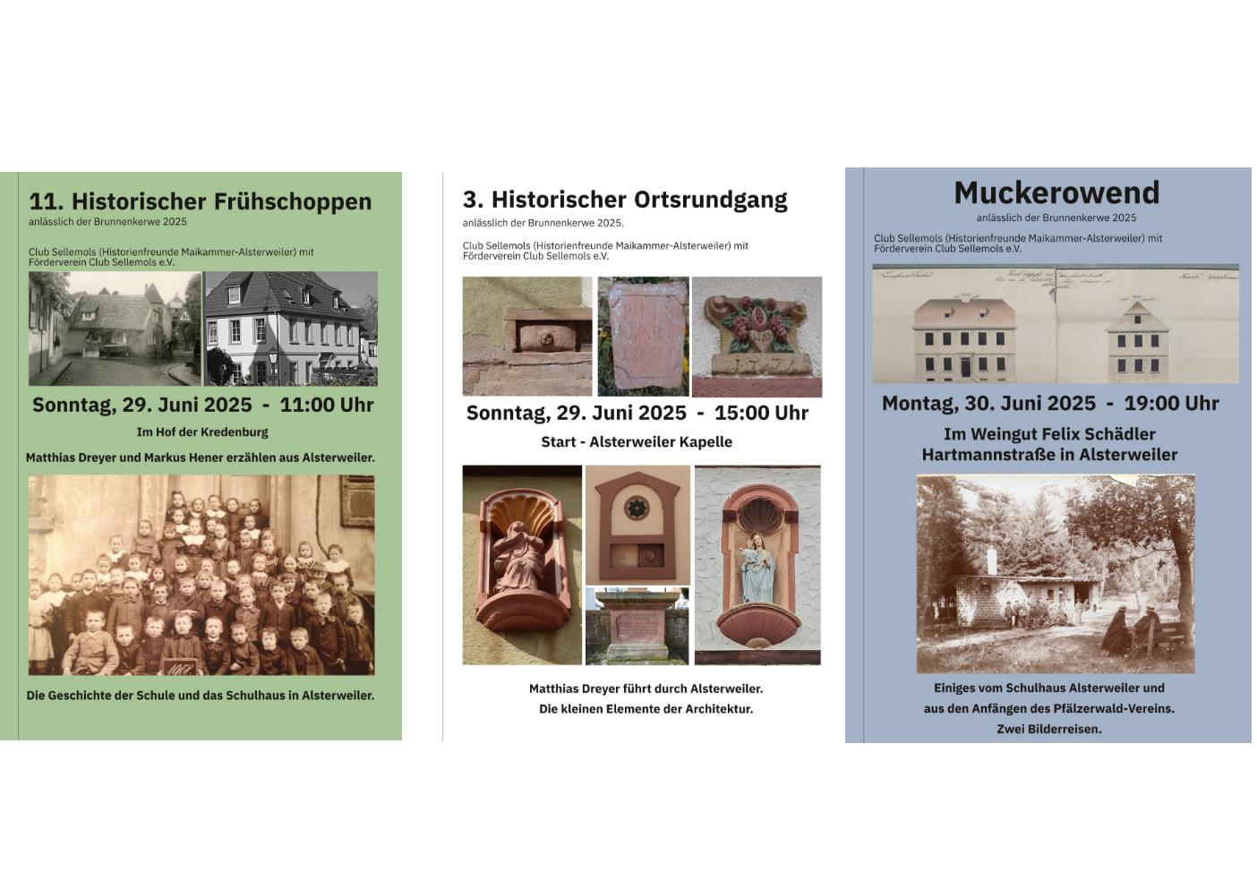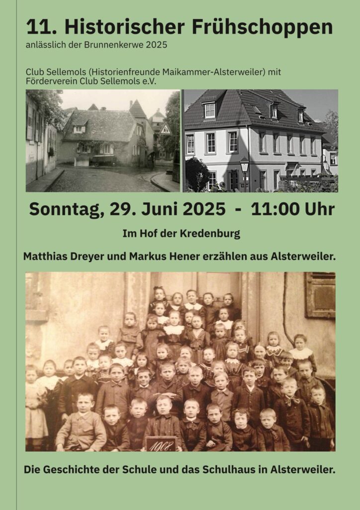 Der Club Sellemols führt am Sonntag, den 29. Juni um 11:00 Uhr seinen „Historischen Frühschoppen“ in der Kredenburg durch. Es ist die 11. Auflage. Markus Hener und Matthias Dreyer erzählen aus Alsterweiler. Schwerpunkt in diesem Jahr ist „Die Geschichte der Schule und das Schulhaus in Alsterweiler“.