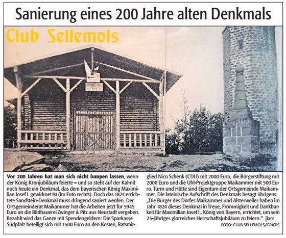 Im August 2025 wurde das vor dem Kalmithaus und -turm stehende Denkmal König Max von der Bildhauerei Zwinger + Pitz aus Neustadt/W. renoviert. Die beschädigte Kugel wurde erneuert und die Inschrift aufgefrischt. Der Dank geht an die Sponsoren, die diese Renovierung im Jahr 201 seitdem das Denkmal steht, ermöglicht haben!