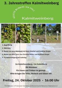 Die traditionelle (Dritte) Jahresfeier im Kalmitweinberg findet am Freitag, den 24. Oktober 2025 ab 16:00 Uhr statt. Der Club Sellemols informiert über die aktuellen Entwicklungen im Weinberg und im Kalmitturm. Für Essen und Trinken ist gesorgt (Einladung erforderlich).